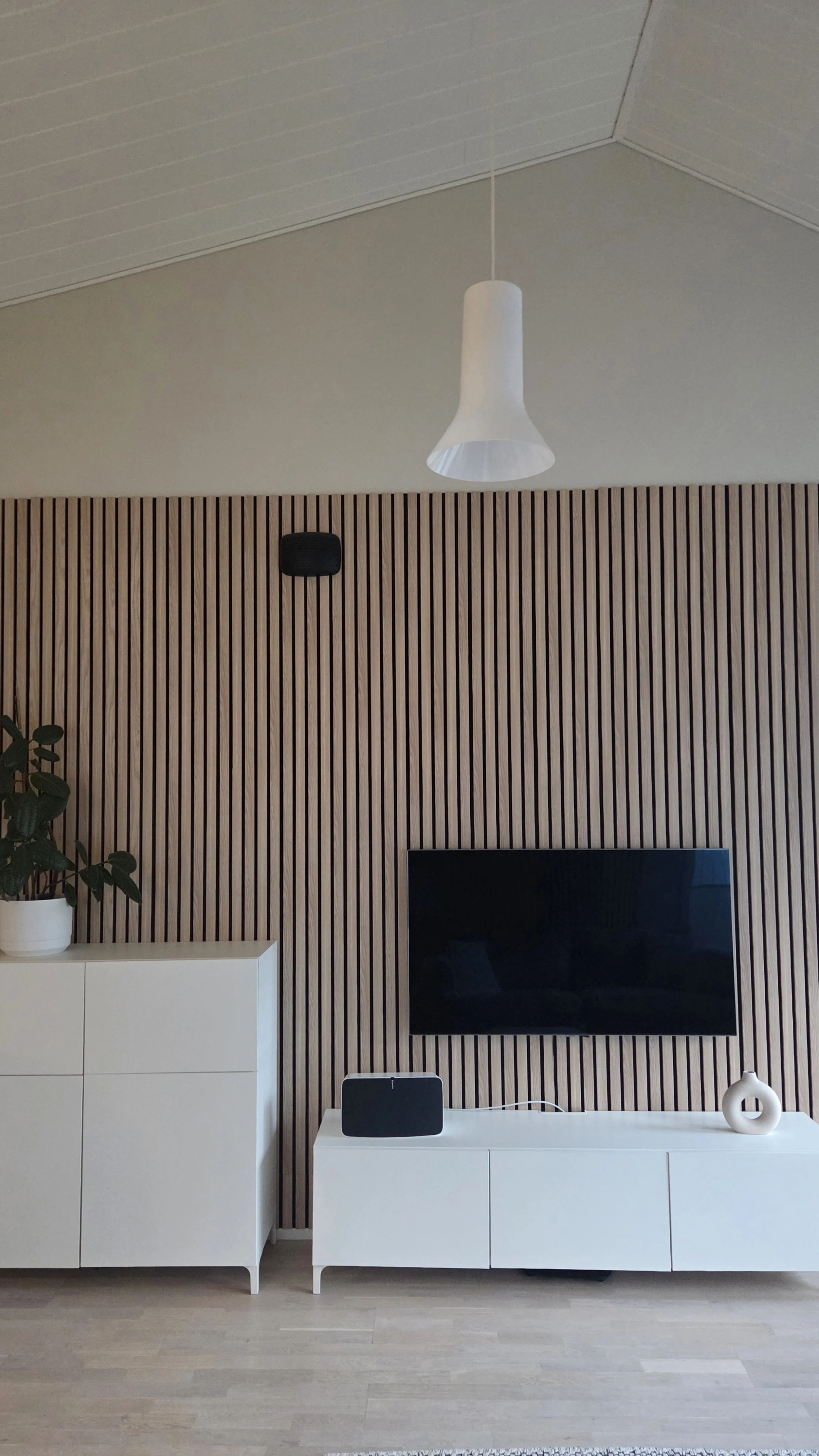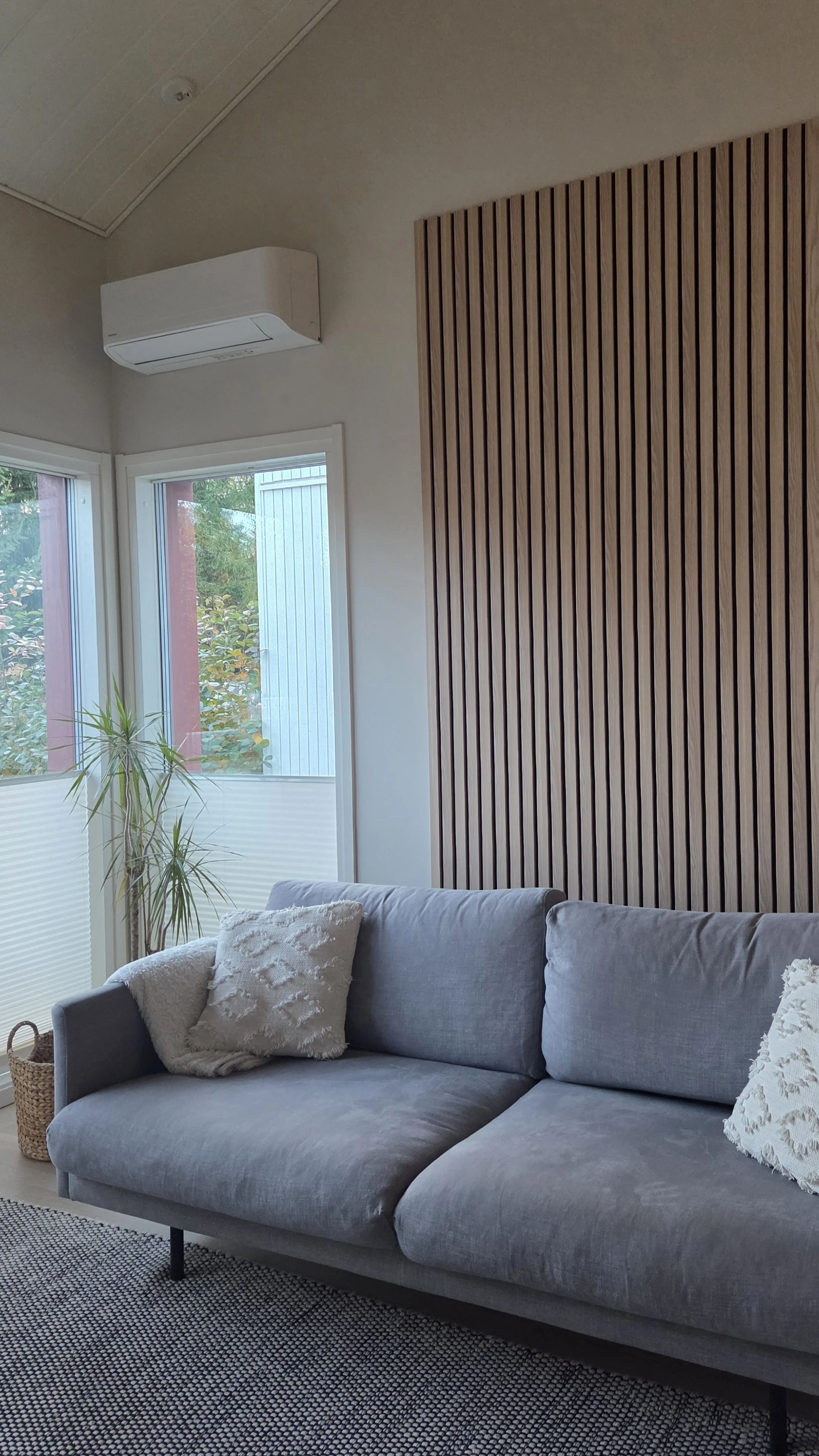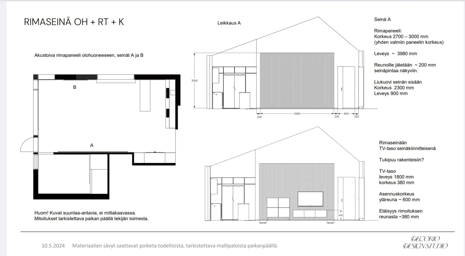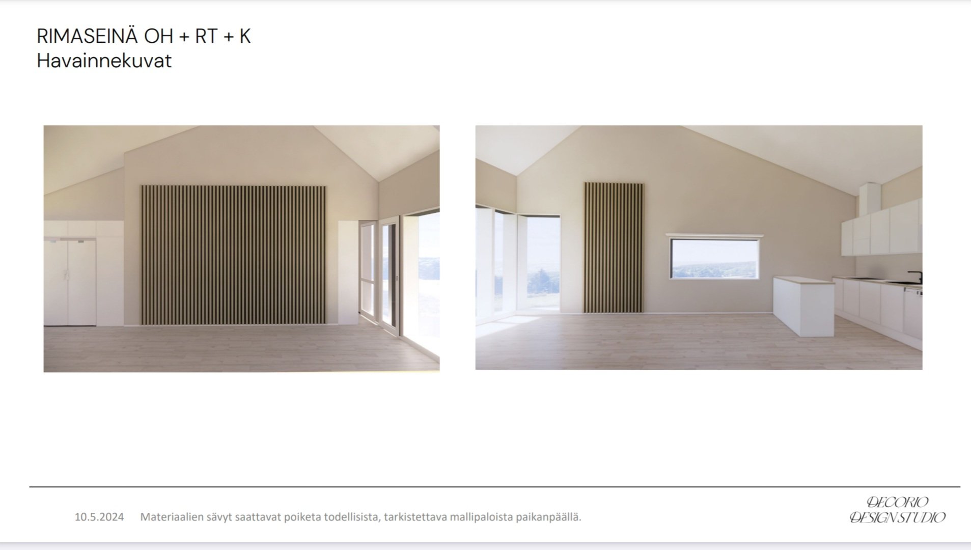 Pintamateriaalisuunnitelman avulla parannettiin kodin oleskelutilojen viihtyisyyttä ja akustiikkaa.