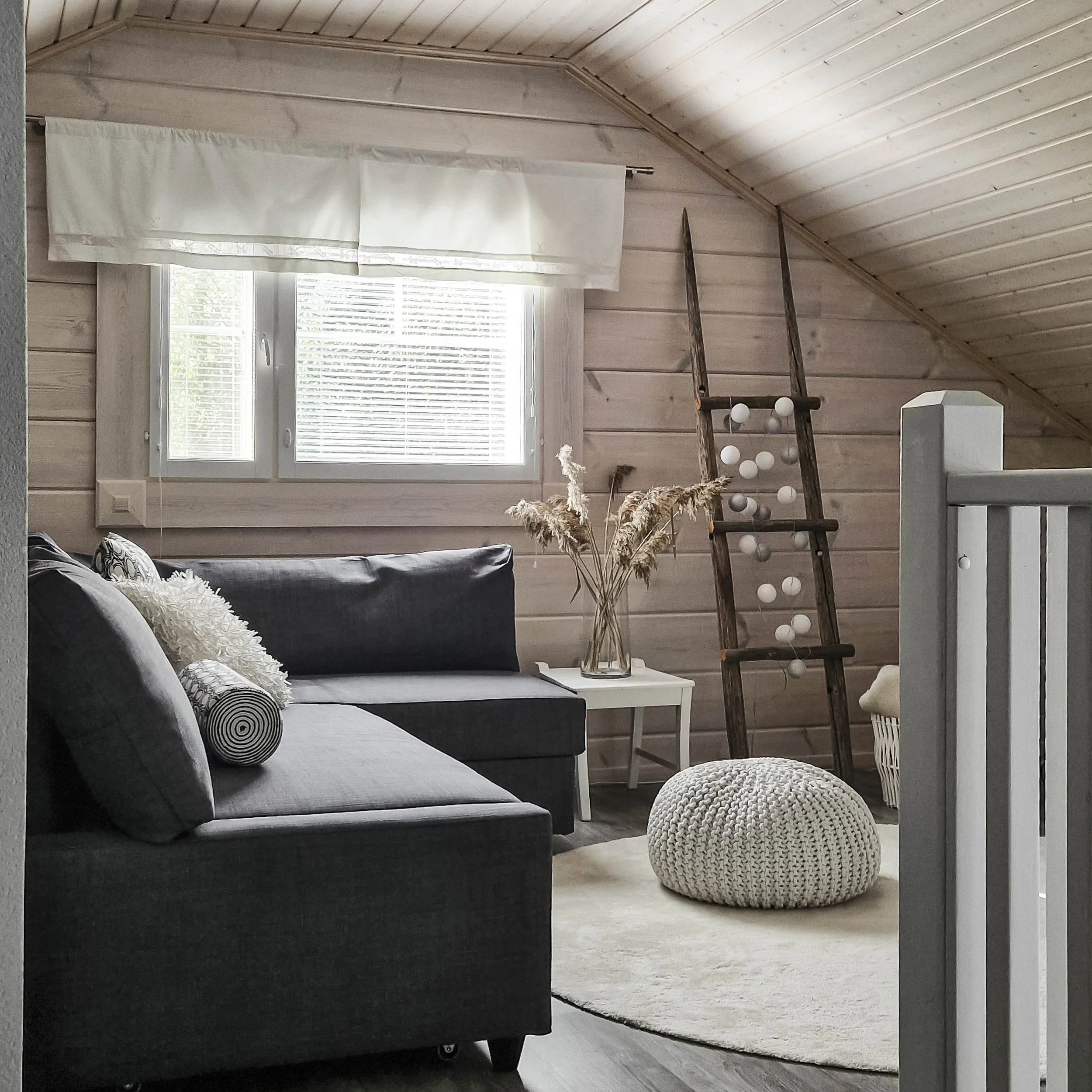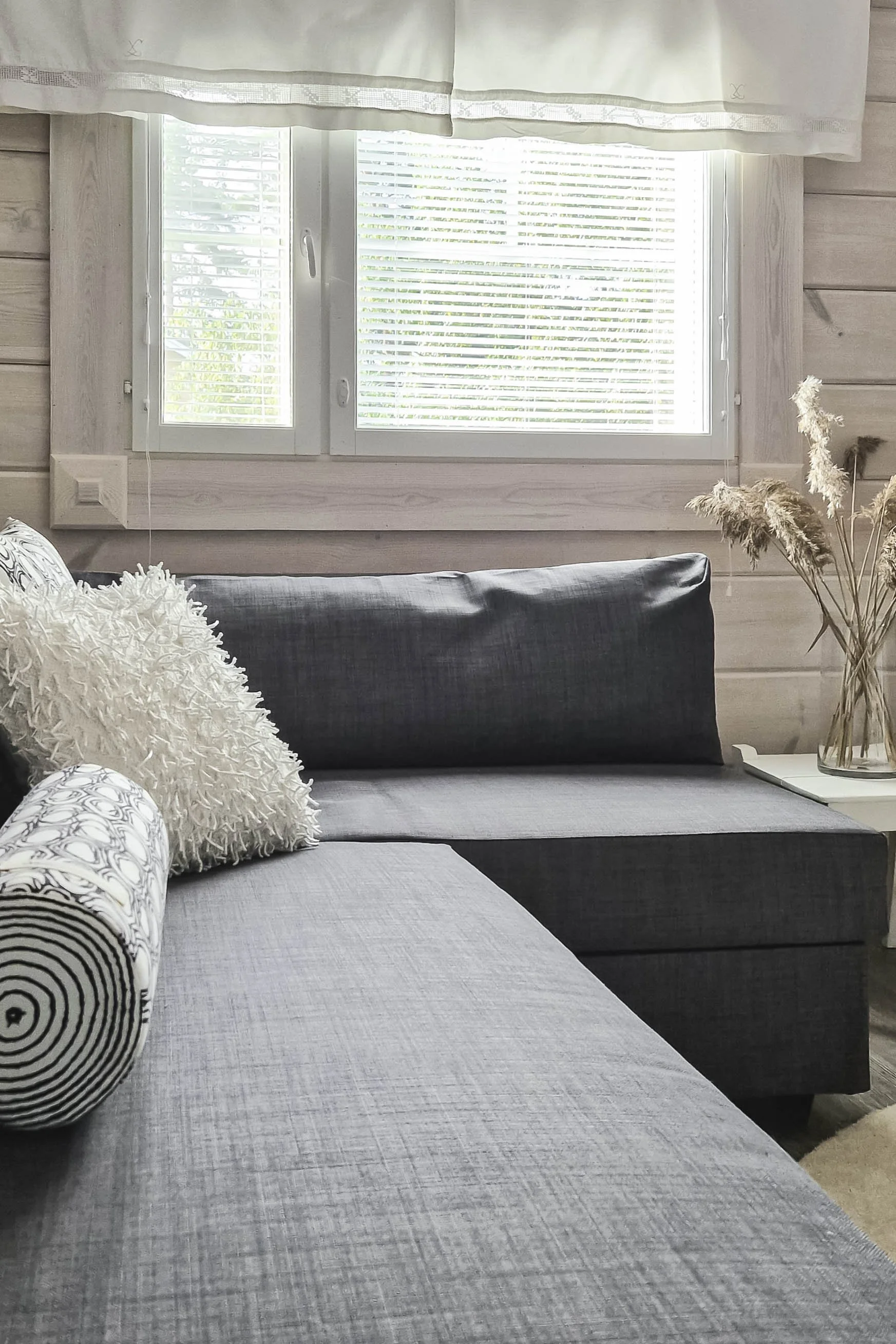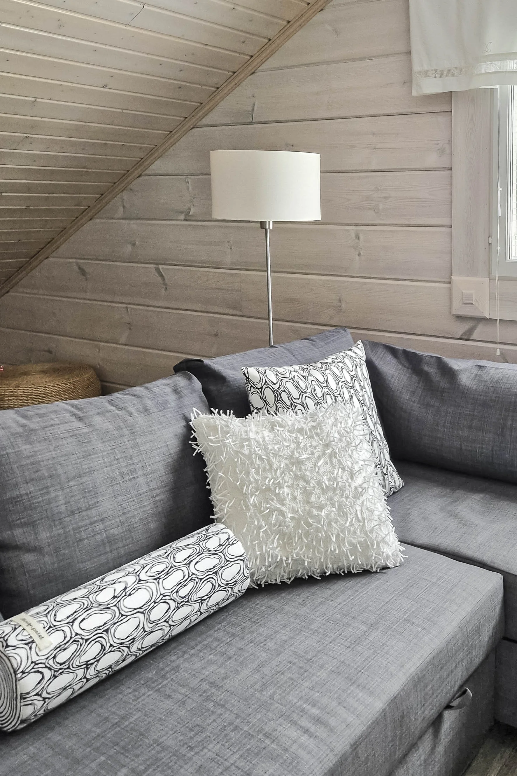 Tila selkeytyi tekstiili- ja kalustevalinnoilla. Olemassa olevia huonekaluja ja tekstiilejä hyödynnettiin mahdollisimman paljon ja tuotiin myös ympäröivää luontoa sisustukseen mm. kaisloilla ja Design Paletin Kaarna - tyynyillä, joiden kuosi toistaa upeasti pihalla olevia kauniita mäntyjä.